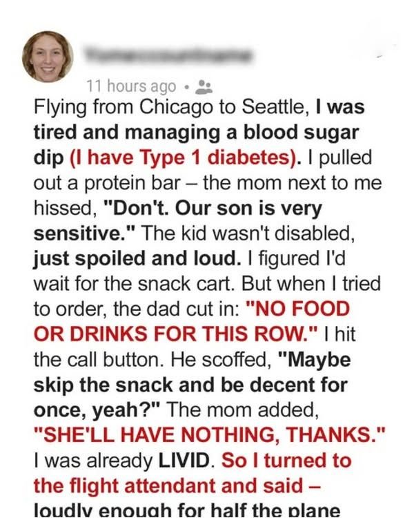 “She’ll have nothing. Our son has sensory triggers,” she told the flight attendant. “He sees food and throws fits. You wouldn’t believe the tantrums. So, unless you want a screamer the whole flight, maybe don’t serve her?”
